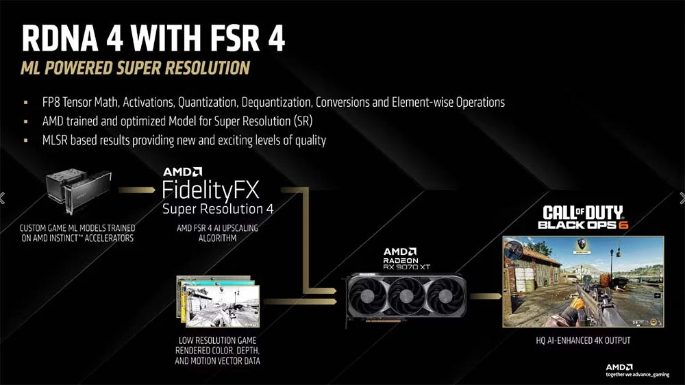 FSR 4 es la evolución del sistema de reescalado de AMD. A diferencia de FSR 2 y FSR 3 —que dependían de un método temporal menos avanzado— FSR 4 usa modelos de aprendizaje automático entrenados específicamente para cada juego.